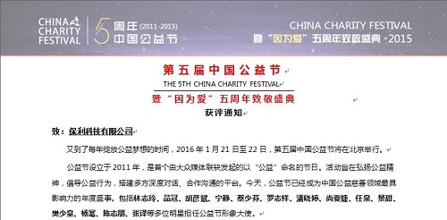 近日,經第五屆中國公益節評委會審議,保利科技獲評“2015年度公益傳播獎”。