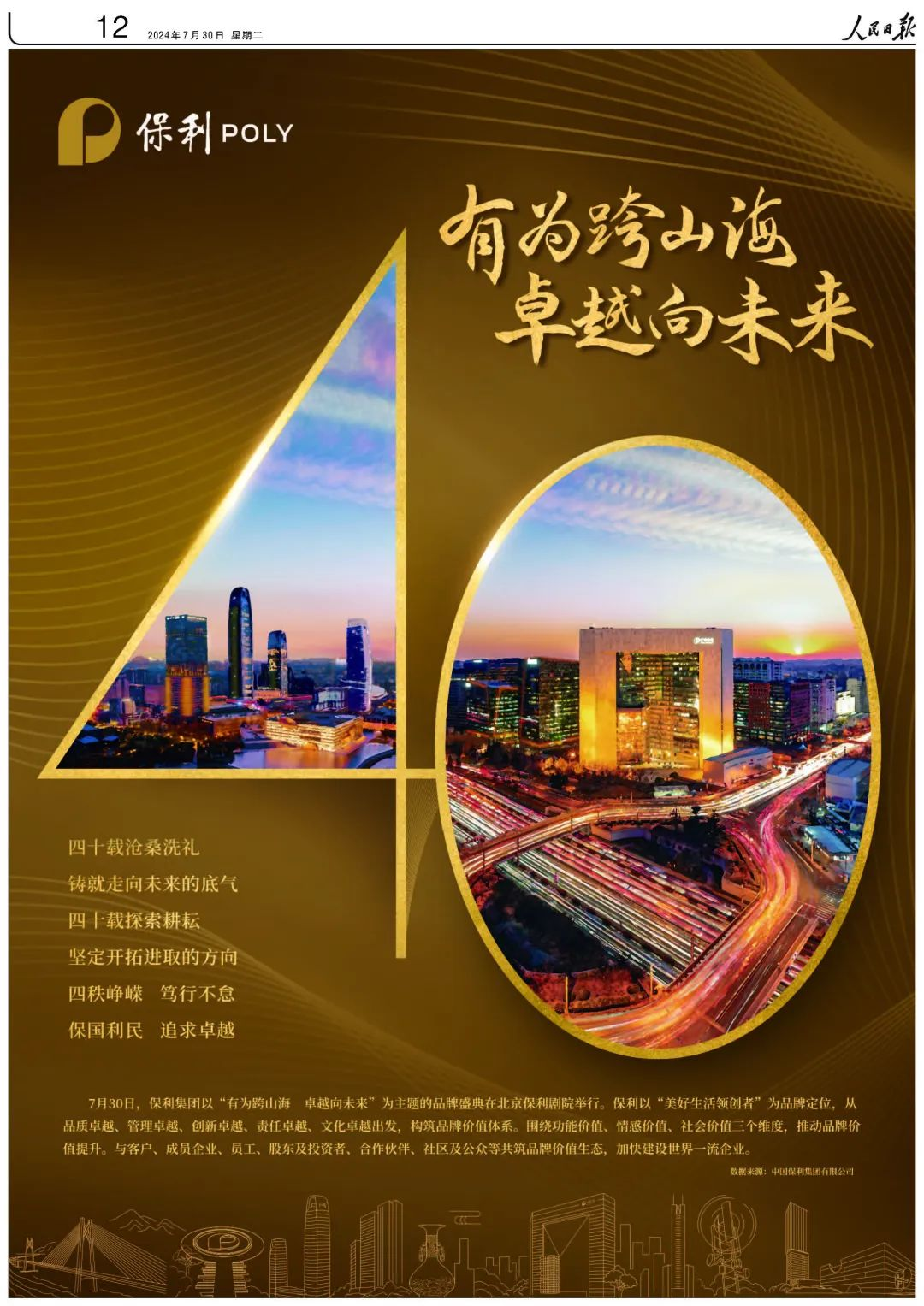 告白流金歲月,共赴美好未來。保利成立四十年之際,保利集團集中開展一系列主題活動,“7·15品牌盛典”以時代交響傳唱保利崢嶸樂章,“卓越四十年”主題宣傳鐫刻卓越保利的時代坐標,各子公司特色策劃匯聚萬千保利人的奮斗群像……全系統以各種形式為保利慶生,以美好接力,獲得社會各界廣泛關注。人民日報、光明日報、經濟日報等權威主流媒體聚焦報道,全網曝光量超過4600萬,詮釋出新征程上保利篤定目標、不懈攀升的新篇章。