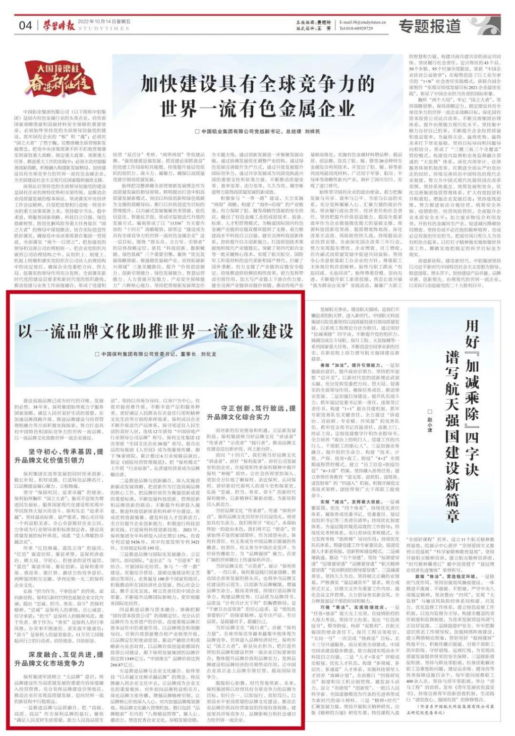 10月14日,《學習時報》刊發(fā)保利集團黨委書記、董事長劉化龍《以一流品牌文化助推世界一流企業(yè)建設》署名文章。文章介紹了保利集團38年來始終服務國家重大戰(zhàn)略與人民美好生活需要,以高質(zhì)量品牌文化建設引領企業(yè)行穩(wěn)致遠的壯闊實踐。數(shù)十載奮楫揚帆勇立潮頭,未來,保利集團將持續(xù)做好品牌文化、厚植發(fā)展動能,以豐碩成果獻禮二十大,在建設世界一流企業(yè)的道路上勇毅前行。
