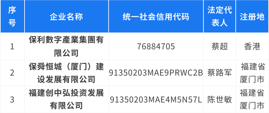 經(jīng)保利集團(tuán)核實(shí),下表所列公司及其下設(shè)各級(jí)子公司均與保利集團(tuán)及所屬公司無(wú)任何隸屬與股權(quán)關(guān)系,也不存在任何投資、合作、業(yè)務(wù)等關(guān)系,其一切行為均與保利集團(tuán)無(wú)關(guān)。請(qǐng)廣大社會(huì)公眾提高警惕,注意防范風(fēng)險(xiǎn),如發(fā)現(xiàn)其違法犯罪行為,請(qǐng)盡快到公安機(jī)關(guān)報(bào)案。