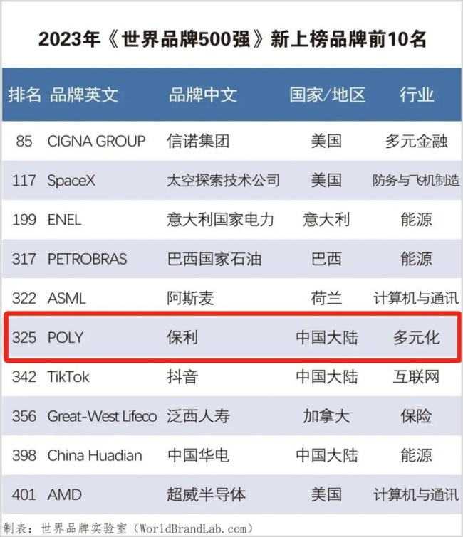 On December 13th, the 2023 World’s 500 Most Influential Brands (20th edition) list, exclusively compiled by World Brand Lab, was released. Poly Group stood out from about 8,000 famous brands in the world and entered the list for the first time, ranking first among the newly selected Chinese brands and 325th in the total list.